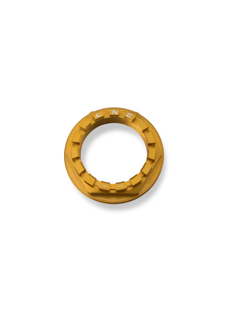 Rechter achterwiel moer om de achtervelg op de drager en achteras vast te zetten. Voor Ducati's enkelzijdige achterbruggen met smalle achteras. Een accessoire dat een bijzondere uitstraling meegeeft. Geheel uit Ergal7075 gemaakt en geanodiseerd, leverbaar in zwart, rood en goud.