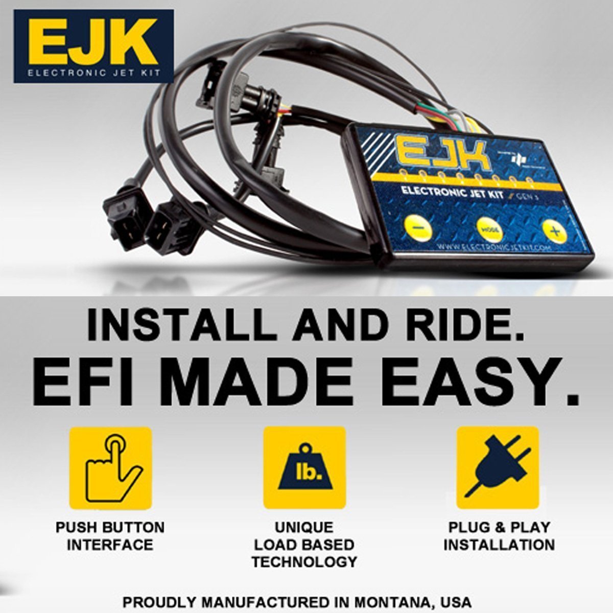 Weniger Ladenzeit bedeutet mehr Fahrzeit. Das Electronic Jet Kit (EJK) ist der Nr. 1 EFI -Controller auf dem Markt für die Installationszeit bis zum Fahren mit großer Leistung. Plug-and-Play bezieht sich nicht nur auf Steckverbinder, um die Installation einfach zu machen, sondern der EJK wird programmiert und bereit für Änderungen der Stufe 1 (After-Market-Rohr- und Luftreiniger). Vergessen Sie das Herunterladen von Karten. Vergessen Sie nachzuschlagen, die Einstellungen zu schauen. Das EJK installiert in nur wenigen Minuten und Sie sind auf eine bessere, leistungsstärkere, glattere Fahrt.