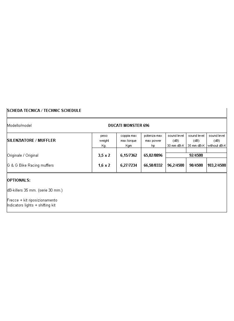 The G&G GP Muffler Set Fits Your Monster Like A Glove Thanks To Their Unique Design. The Exhausts are placed close to the tail section and follow the lines of the bike perfectly. This is the Sleekest Set Available for the Monster 696, 796 and 1100 (s). Despite its Sleek design, The Sound is Impressive and Fits the Ducati Like It Should: A Deep Sound, with a Dark Rumble in the Lower RPMS and Add a Sporty Note in the Higher RPMS, which Fits Your Ducati. If there's any such as a no-brainer for your monster, this is it.
