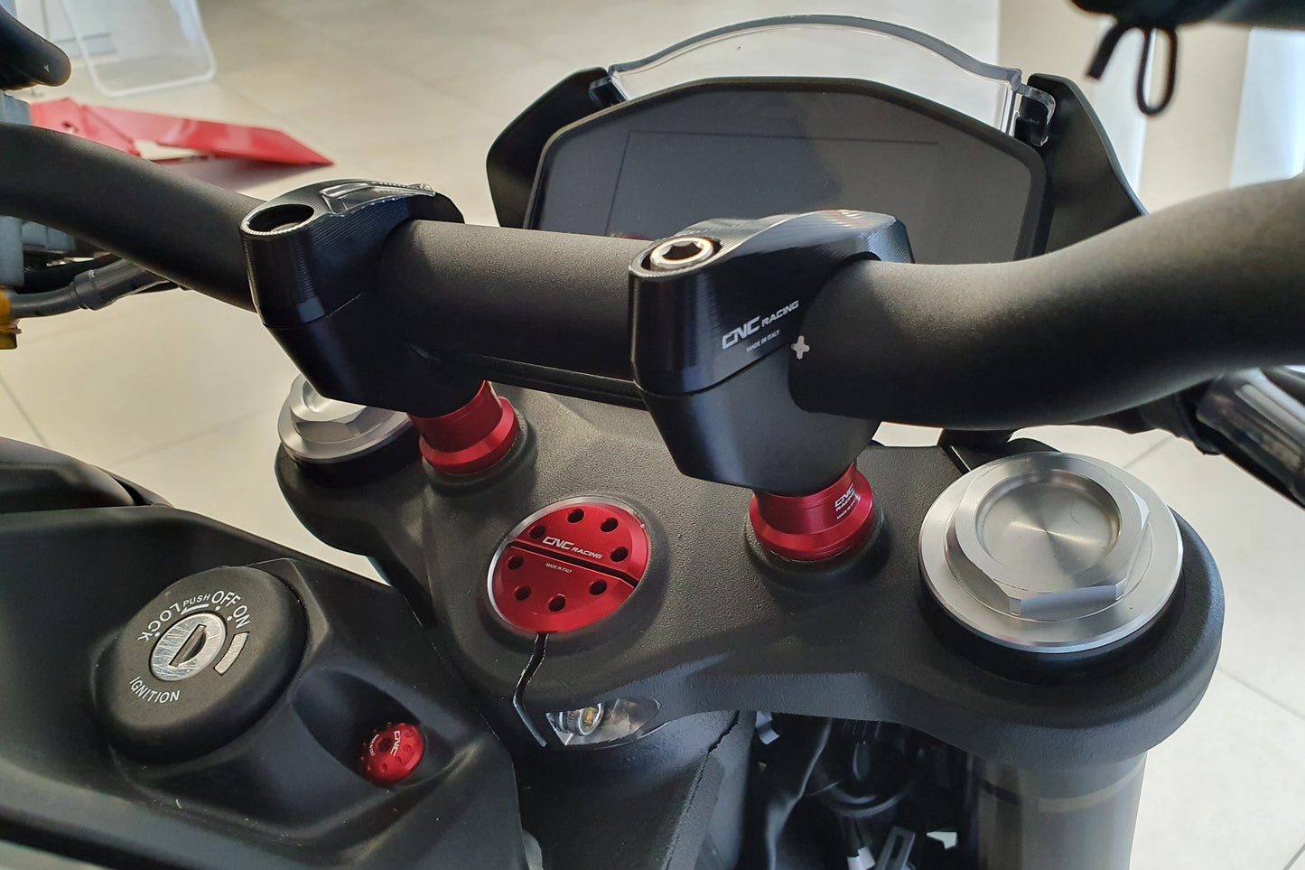 Deze bovenste kroonplaatmoer van CNC Racing is een klein onderdeel met een groots effect. Het vervangt de saaie, standaard grijze moer van je Ducati en zorgt voor een krachtig visueel accent midden op je cockpit. Elke rit opnieuw zie je deze stijlvolle upgrade – en elke keer opnieuw doet het je glimlachen.