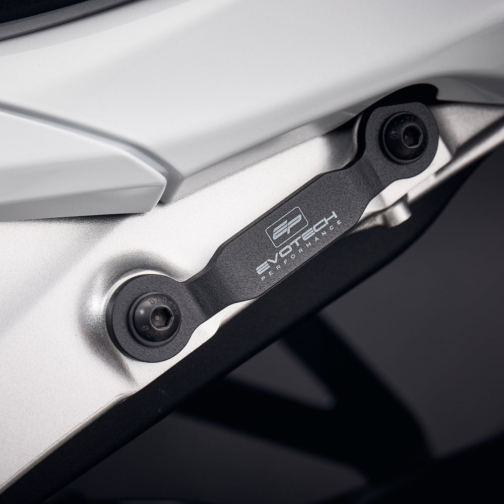 Evotech Performance have manufactured an exhaust hanger blanking plate kit that is a direct replacement for both OEM pillion pegs.