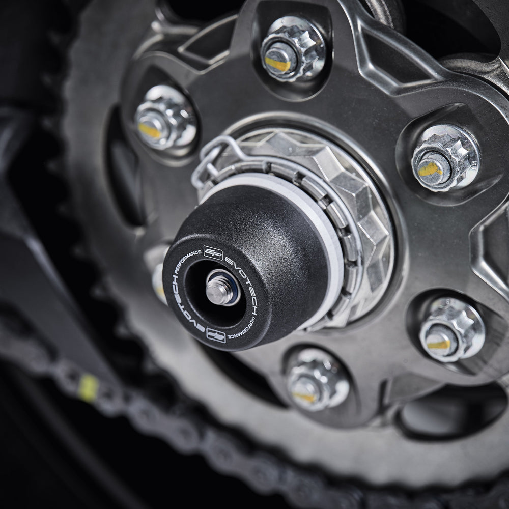 The EP Spindle Bobbins Kit for the Ducati Monster 1200 S defend the lower front forks, brake calipers and rear swingarm from expensive damage. If an incident were to occur, the strong materials are designed to take impact first. Furthermore, the innovative Evotech Performance design ensures the nylon bobbin heads can rotate above the aluminium to reduce wear on the part and stress on the wheel. At the rear, the single sided swingarm is protected using our signature bobbin whilst the spindle rod is secured through the wheel by an anodised red hub stop.
