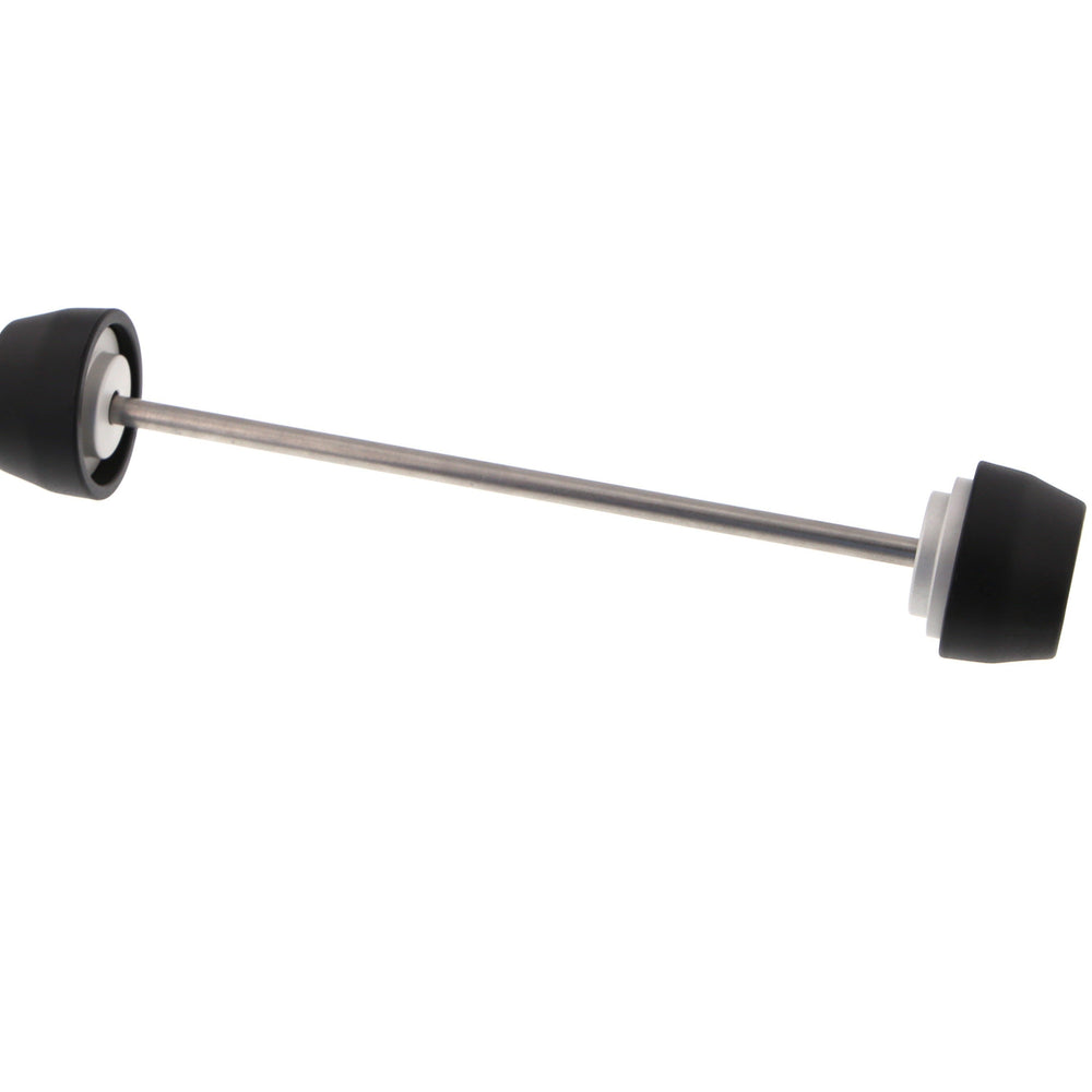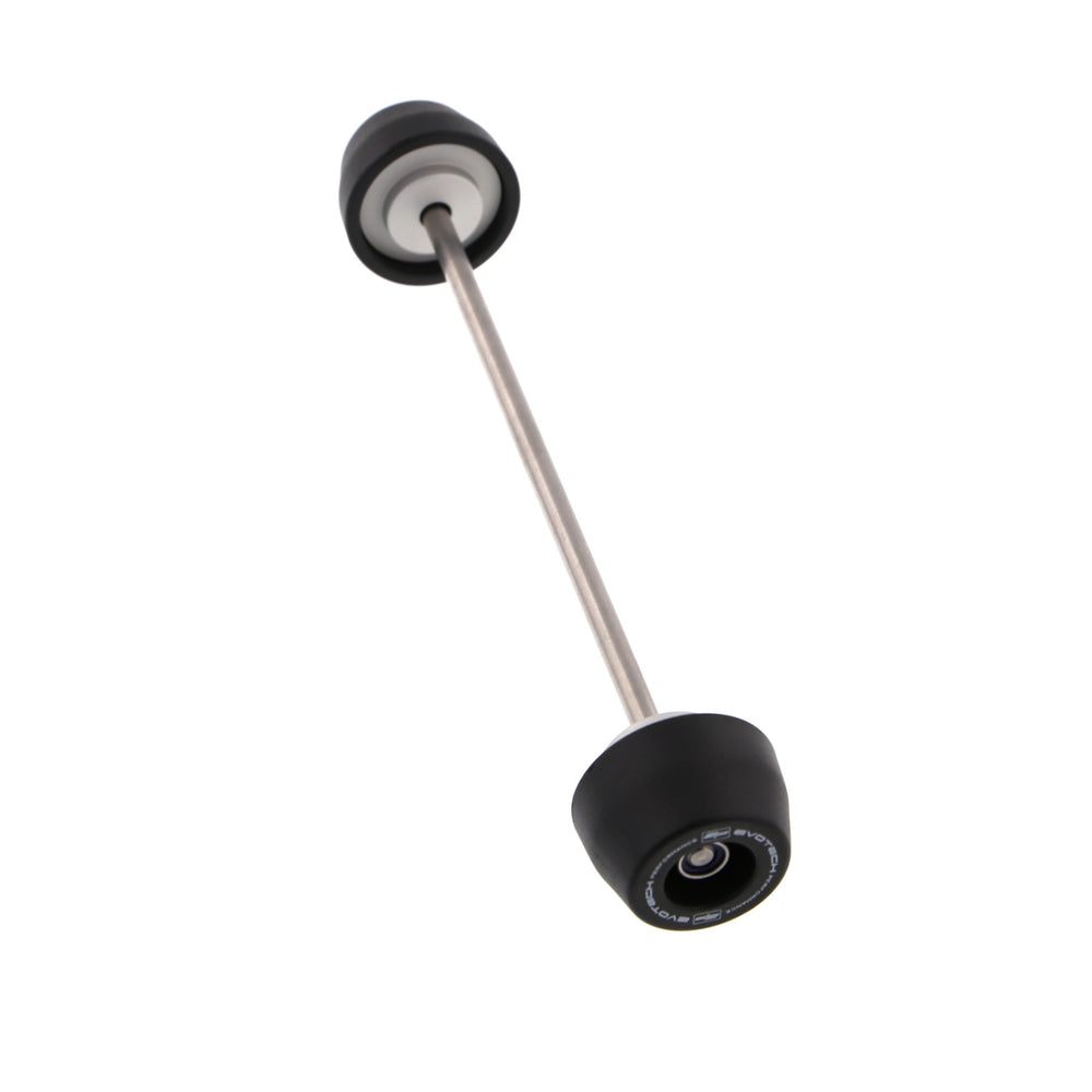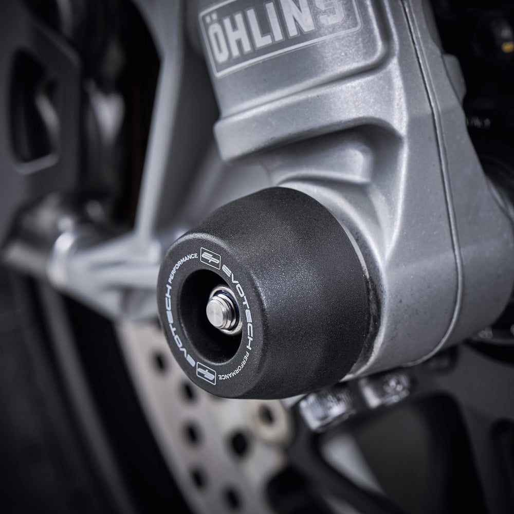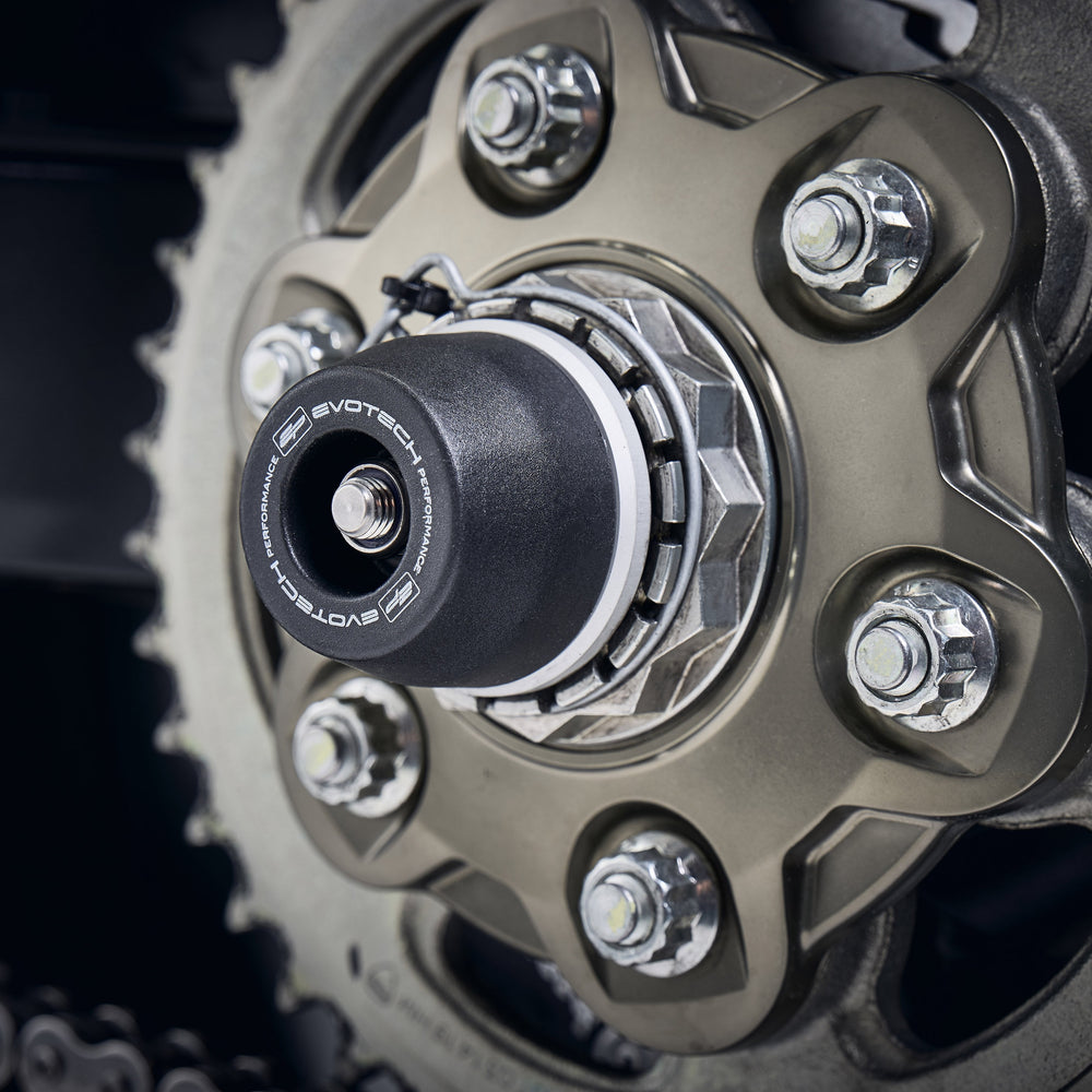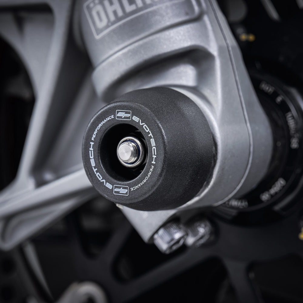 The EP Spindle Bobbins Kit for the Ducati SuperSport guard the lower front forks, brake calipers and rear swingarm from costly damage. If an incident were to occur, the strong materials are designed to take impact first. Furthermore, the advanced Evotech Performance design ensures the nylon bobbin heads can rotate above the aluminium to reduce wear on the part and stress on the wheel. At the rear, the single sided swingarm is protected using our signature bobbin whilst the spindle rod is secured through the wheel by an anodised red hub stop.