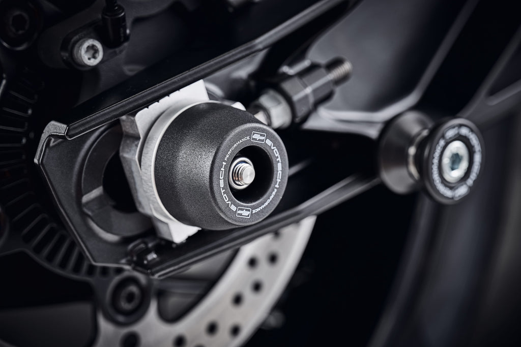 Offering protection to the wheel spindle, lower front forks, brake calipers and swingarm to the KTM 890 Duke GP, EP Spindle Bobbins Kits are made from engineering grade materials. The black bobbins, featuring a strengthening aluminium inner, sit discreetly either side of the wheel spindle held by a rolled-thread spindle rod. The strong materials of injection-moulded nylon and aluminium hope to be first to receive impact should the unfortunate occur, reducing costly wear and damage to your motorcycle.